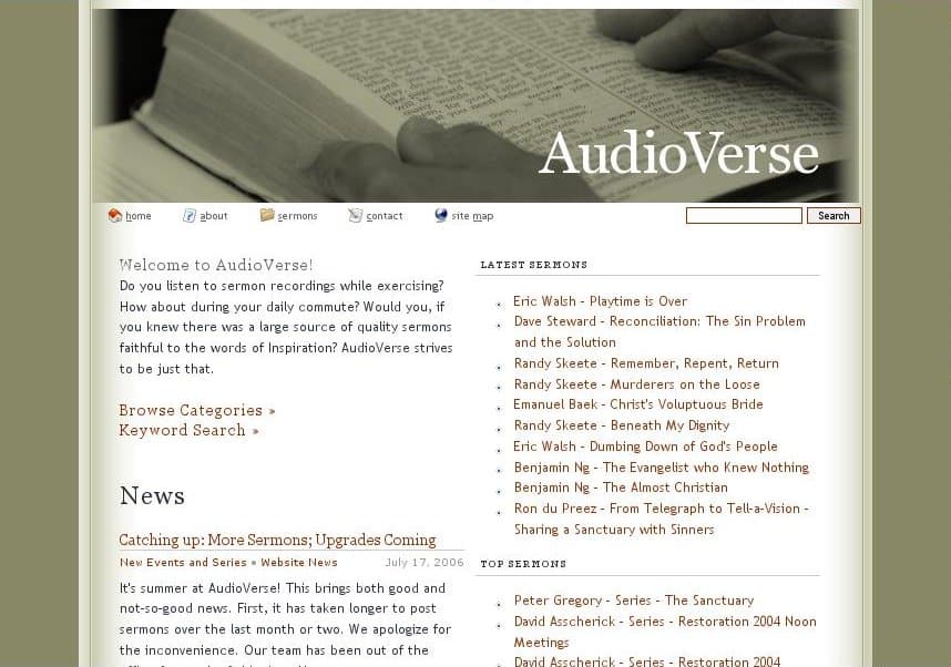 Curtis put the idea into action and quickly began developing a sermon website. A contest was held at Advent HOPE Sabbath School to choose the name, during which over 100 names were submitted. "AudioVerse" was the winner, and the AudioVerse.org website was launched on October 22, 2005.